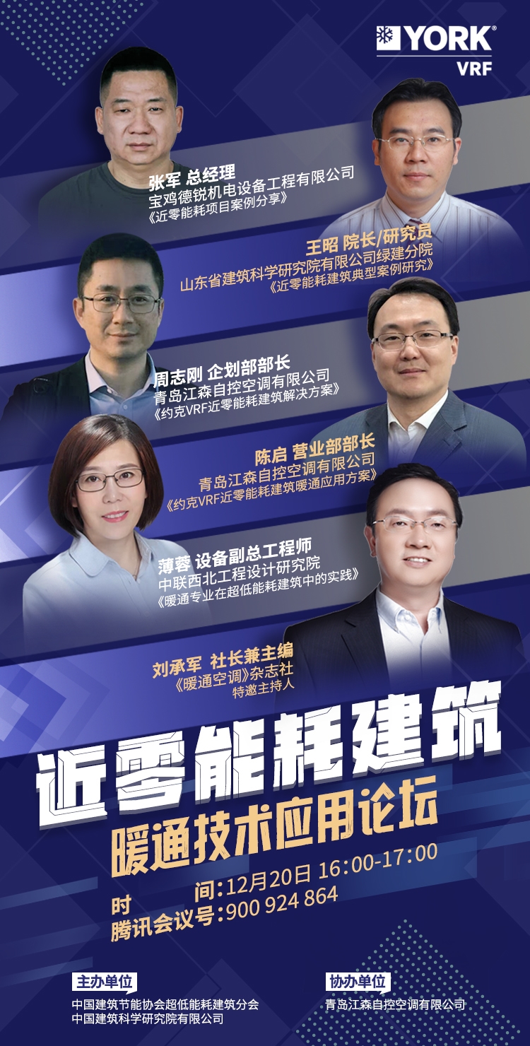 中国建筑节能协会超低能耗建筑分会主办的主题为“规模推广近零能耗建筑 提升建筑减碳自主贡献”2021年第八届全国近零能耗建筑大会主论坛于2021年12月20日在京召开,12个专题高峰分论坛也分别于20-21日陆续在腾讯网络会议举办。期间,由中国建筑节能协会超低能耗建筑分会、中国建筑科学研究院有限公司主办,青岛江森自控空调有限公司协办的“近零能耗建筑暖通技术应用论坛”分论坛于12月20日下午召开,《暖通空调》杂志社社长、主编刘承军主持会议。会议以线上线下相结合的形式开展,特别邀请到了中联西北工程设计研究院设备副总工程师薄蓉、山东省建筑科学研究院有限公司绿建分院院长、研究员王昭、宝鸡德锐机电设备工程有限公司总经理张军、青岛江森自控空调有限公司营业部部长陈启、青岛江森自控空调有限公司产品经理徐磊等嘉宾,分别从顶层视野、行业先锋、规模案例等方面分享近零/零碳建筑中国技术体系的发展。