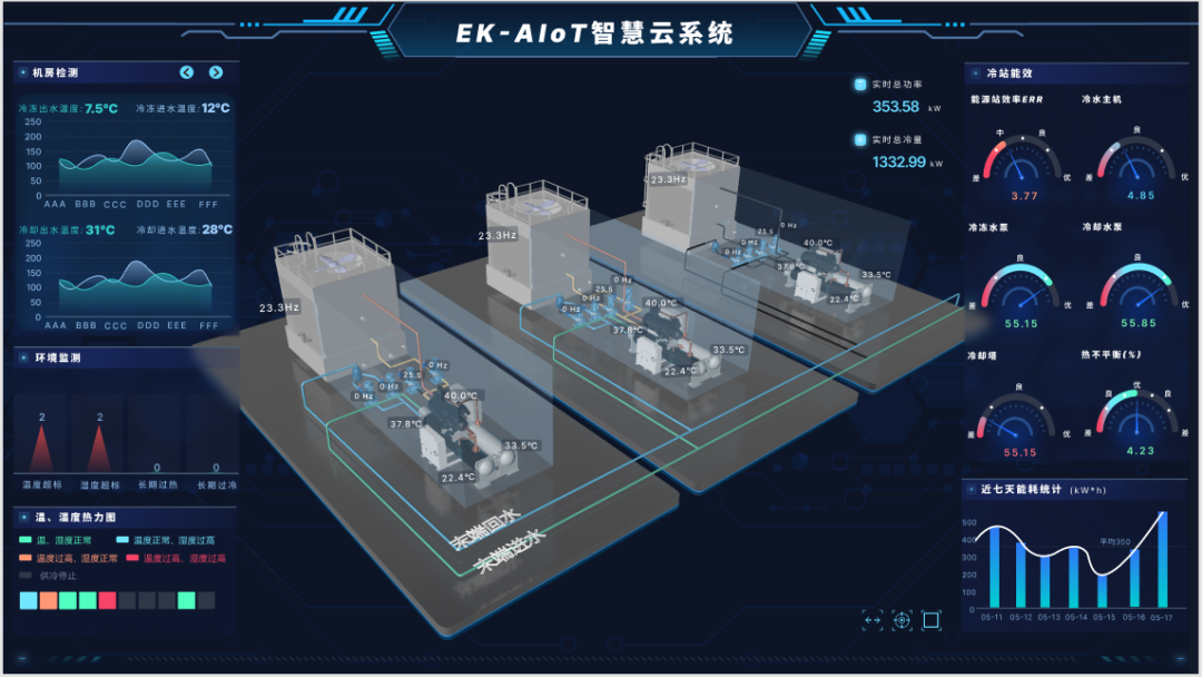EKWR云智慧高效集成冷站结合高效机房设计理念标准化BIM三维设计,加入了高效机房控制系统及能耗能效检测,同时为客户提供EK- AIoT智慧云平台控制功能,可以远程控制与监测,保证机组高效运行,为客户降低全生命周期使用成本,缩短客户投资回报周期。全年运行综合能效EERaO超过5.0。