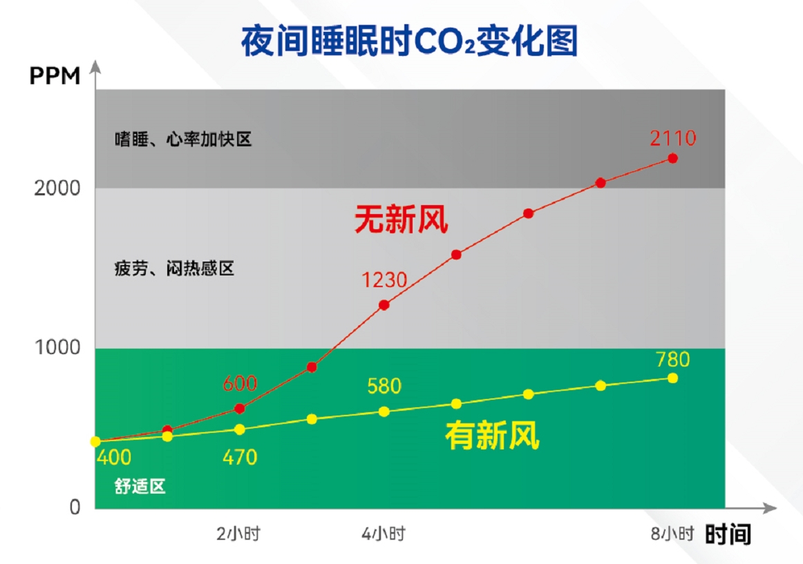 根据健康医学认定,室内二氧化碳浓度≤1000ppm*是健康范围,但在夜间睡眠时,如果门窗紧闭,8小时后二氧化碳浓度往往会飙升至2000ppm以上。高浓度的二氧化碳会抑制大脑供氧,进而导致人犯困、头疼,严重时会影响到身体健康和生活状态。