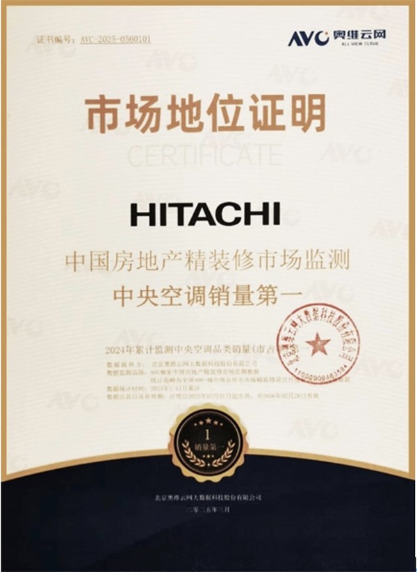 日立中央空调以强大的产品实力、服务体系与品牌影响力全面领跑市场,也赢得了行业的充分认可。凭借2024年在房地产行业的不俗表现,获得了奥维云网颁发《市场地位证明》,认证日立在2024年中国房地产精装修市场“中央空调销量第一”。