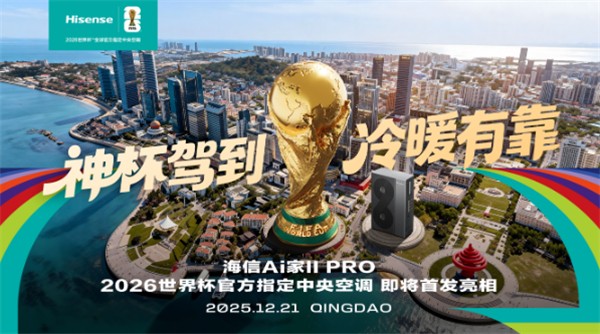 12月21日,作为2026年世界杯官方赞助商,海信将邀请象征足坛最高荣耀的“大力神杯”来到中国,并在青岛奥帆中心面向公众免费展出。届时,海信2026世界杯全阵容定制产品将重磅亮相,官方定制中央空调海信Ai家II PRO亦将和观众见面,以全新风采与传奇同框,为热爱加温。