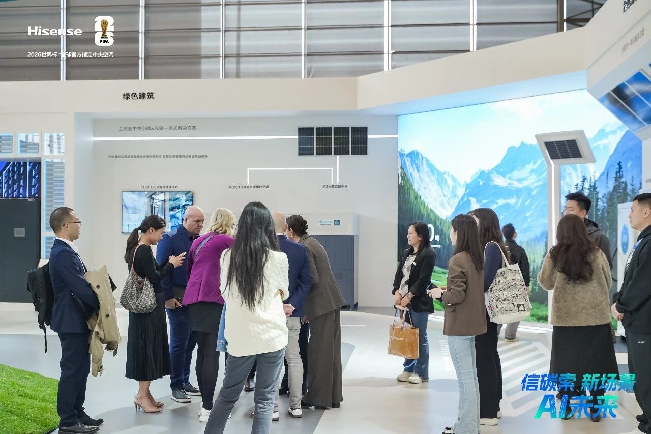 海信中央空调深度践行ESG理念,现场展出M3光合&直驱系列多联机、海信光伏M3光合直驱多联机等绿色节能产品。该展区的产品依托“ALL IN ONE” 中枢架构,全面满足 “光储直柔” 与零碳建筑要求,可以为更多家庭与商业空间打造更高效、更低碳、更智慧的空气解决方案。