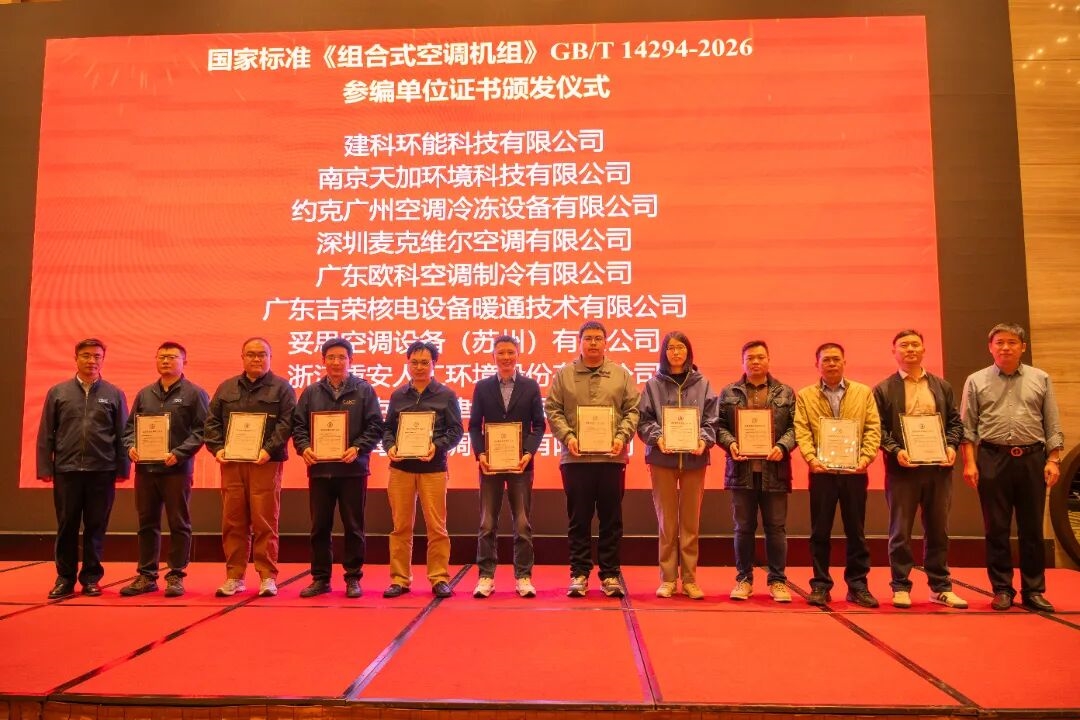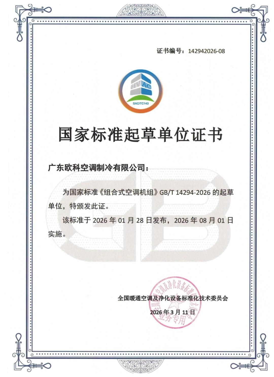 近日,国家标准《组合式空调机组》GB/T14294-2026参编单位证书颁发仪式在广东隆重举行。广东欧科空调制冷有限公司(简称“EK空调”) 凭借深厚的技术积淀与专业实力,积极参与该标准的制定工作,为推动行业规范化发展贡献EK智慧。