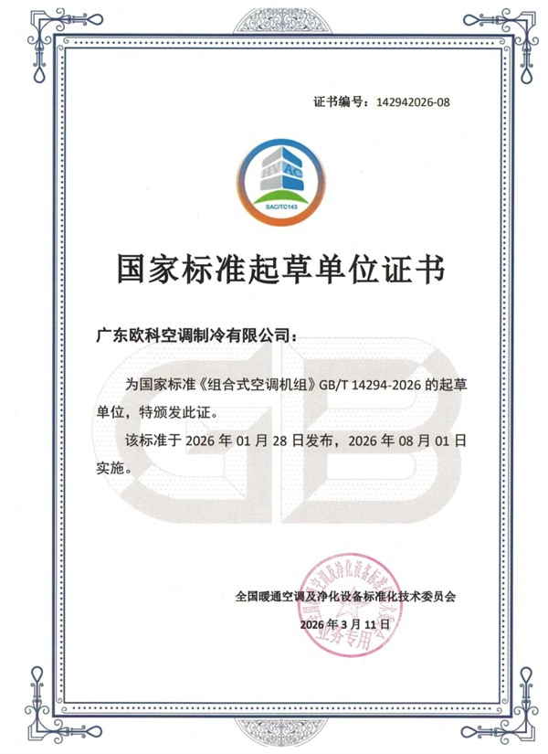 近年来,EK空调成功参与《组合式空调机组》GB/T14294-2026、23R203《制冷供热机房装配式设计与安装》图集、《热泵和冷水机组能效限定值及能效等级》GB 19577-2024、《数据中心蒸发冷却空调系统运维管理》T/DZJN 82—2022等一系列国家标准、行业标准、团体标准的编制工作,覆盖严寒地区热泵应用、畜禽养殖、数据中心等多个细分领域。