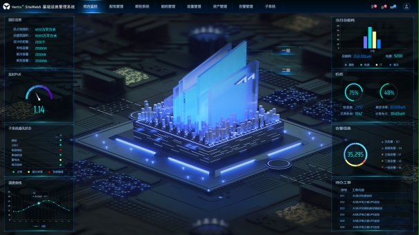Vertiv™ SiteWeb6基础设施管理系统,安全、高性能、高频海量数据接入,数据可视化,一屏呈现所有关键指标,AI柔性智控、实时管理能源动态、快速定位故障点,管理效率提升15%+、资产利用率提高20%+。