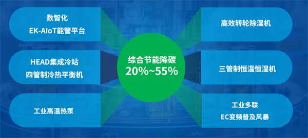 针对制药行业能耗和运维痛点,EK工业空调提出完整的制药厂房节能降碳路线,系统推进洁净、冷源、热源、干燥及运维五大需求向EC、高效、低碳、节能和数智化运维方向升级。