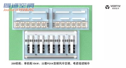 在空调室外机上,每个POD采用22套Liebert®VCC集中式高效冷凝器,占地仅有100平方米,对于6个POD合计1200个机架规模的室外机组,占地仅600平方米,仅占楼顶面积的20%,能够确保灵活部署,并大幅降低维护难度和成本。