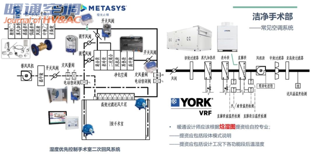 庞志伟工程师首先简单介绍了洁净手术部的湿度优先控制概念。在《医院洁净手术部建筑技术规范》GB50333中明确提到,整个洁净手术部设置集中新风冷热处理设施时,宜采用新风湿度优先控制原则。不同于“湿度先行控制”对表冷段的控制,“湿度优先控制”是在新风集中处理时,负担一部分、甚至全部的室内负荷,使得洁净室内的洁净空调在干工况下运行,做到室内无冷凝水的状态。