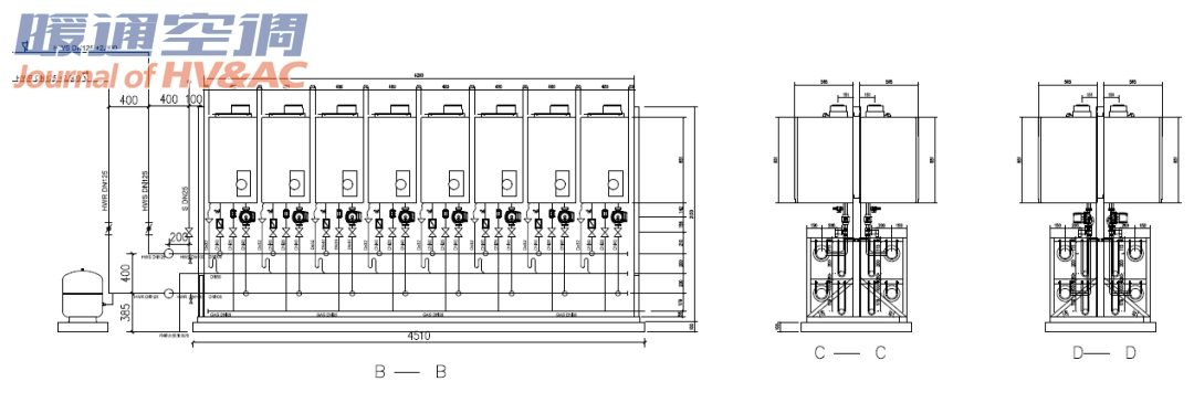 其中16台燃气炉,供给高区(12~21层)采暖换热器,16台供给低区采暖换热器(1~11层)。高低区两套系统独立运行。两组热源中间有跨越管连接,常闭阀门,互为备用。末端共计采用783组钢制板式散热器。一次侧采用一炉一泵,锅炉侧定流量运行,二次侧为变流量系统,采用恒定水泵进出口压差的变频控制方式。