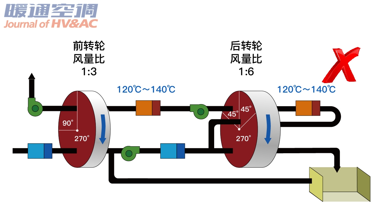 评价:对双转轮除湿理解程度不够,前后转轮除湿量数据掌握不精确,导致前后转轮匹配不合理,再生能耗偏高,后转轮偏大,初投资较高。